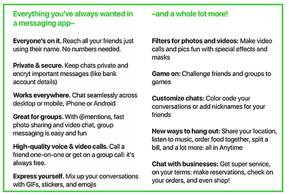 Sa version mobile actuellement testée sur iOS et Android, permettrait les appels vocaux et vidéos, la création de groupes, du social gaming, la commande de repas en ligne ou de musique , l’échange de corrdonnées bancaires cryptées et, bien sûr les interactions avec des marques et des professionnels.