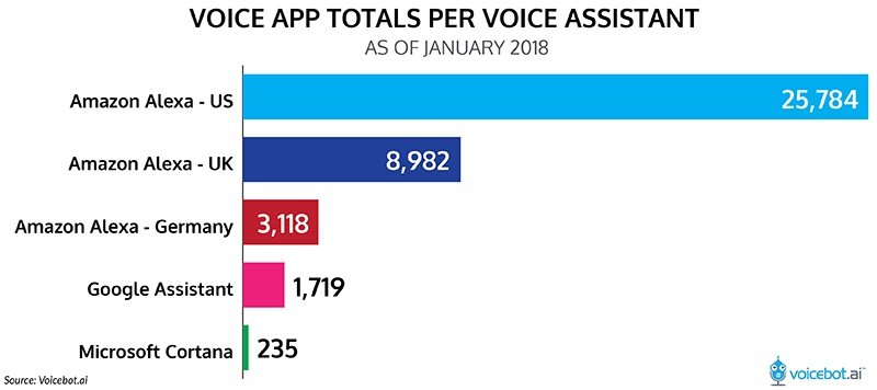 D’après la dernière étude de VoiceBot, Alexa totaliserait près de 37.000 Skills en comptant les Alexa Skills Anglais et Allemands.