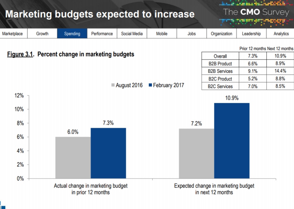 51% des CMO anticipent une hausse de leurs budgets marketing. La hausse moyenne anticipée est de 10,9% au cours des prochains mois