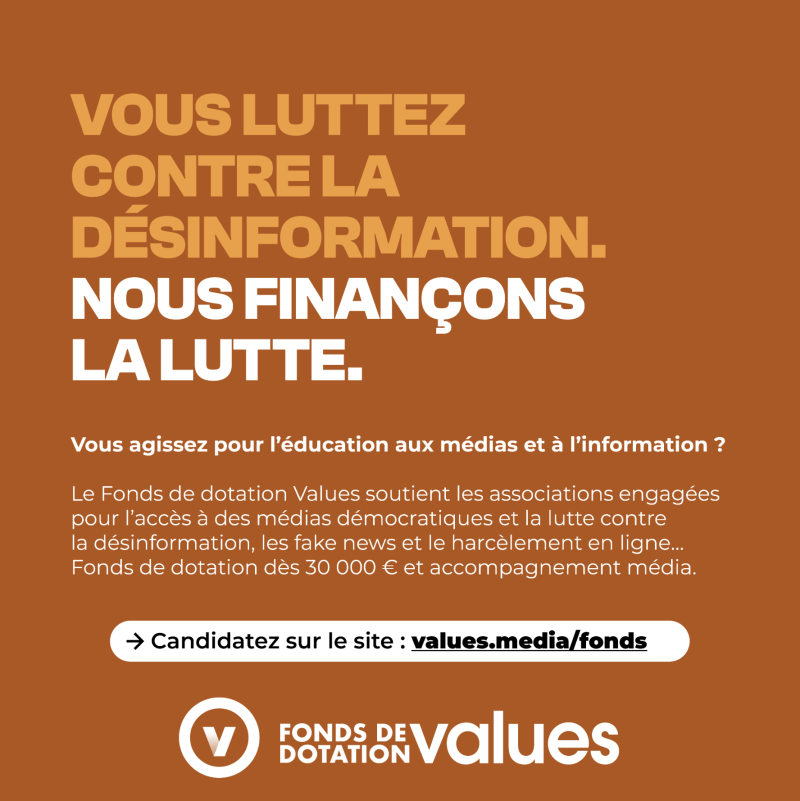 Créé par Values.media, le Fonds de dotation a pour vocation de financer et accompagner des projets d’intérêt général portés par des structures à but non lucratif, œuvrant notamment pour le pluralisme des médias, la responsabilité éditoriale ou encore la lutte contre la désinformation.