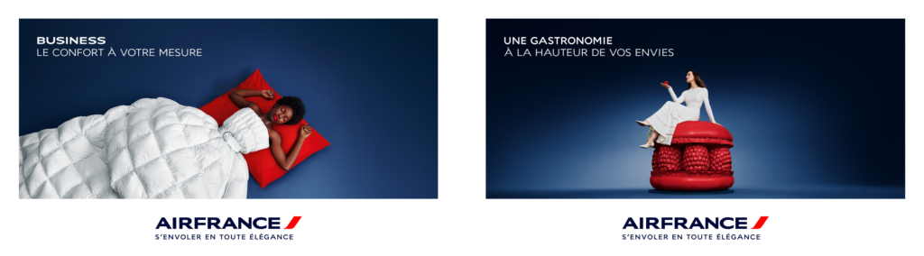 Si la compagnie reste fidèle à son territoire bleu – blanc – rouge, Air France et son agence font évoluer ce territoire pour assumer pleinement, à travers une touche de rouge mise en exergue, ce qui fait la singularité de l’expérience Air France sur ces piliers clés, en vol comme au sol.