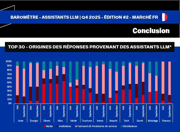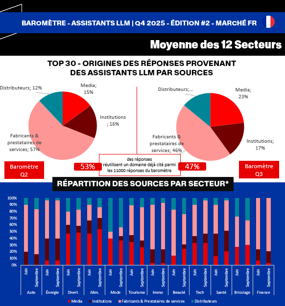 - Les institutions restent stables (17 %, contre 16 % au T2) et se distinguent surtout dans les secteurs santé, énergie et immobilier, où elles demeurent des sources de référence pour les LLM.
