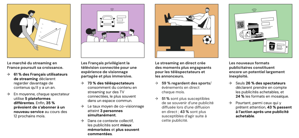 73 % des streamers français utilisent des téléviseurs connectés, souvent dans des contextes de co-visionnage, ce qui renforce la mémorisation et la pertinence publicitaires. 49 % déclarent que voir des publicités en co-visionnage les rend plus mémorables.