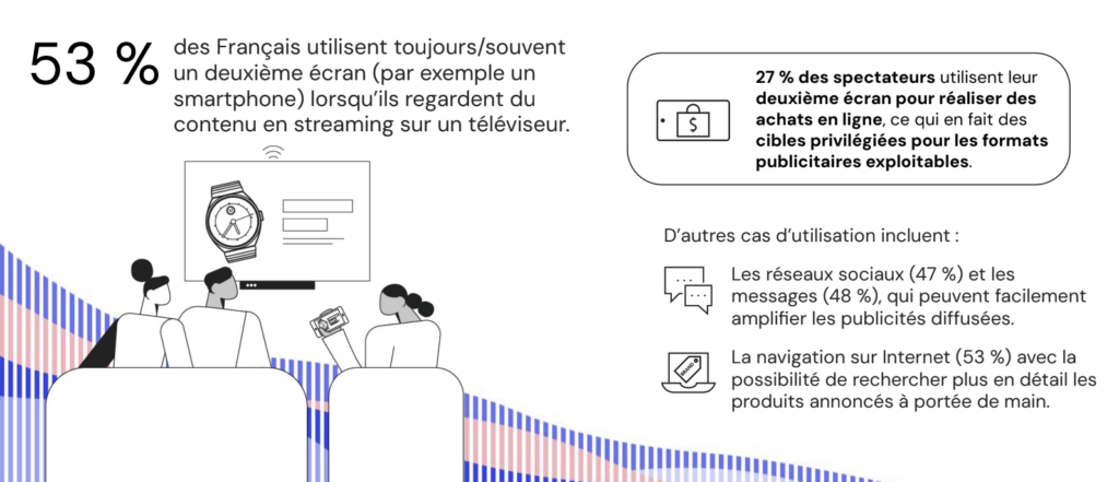 53 % utilisent un mobile tout en regardant la TV en streaming, créant des points de contact additionnels pour les annonceurs. Cette exposition cross-device améliore l’efficacité : 39 % des consommateurs se disent plusenclins à agir lorsqu’ils voient des publicités sur plusieurs écrans.