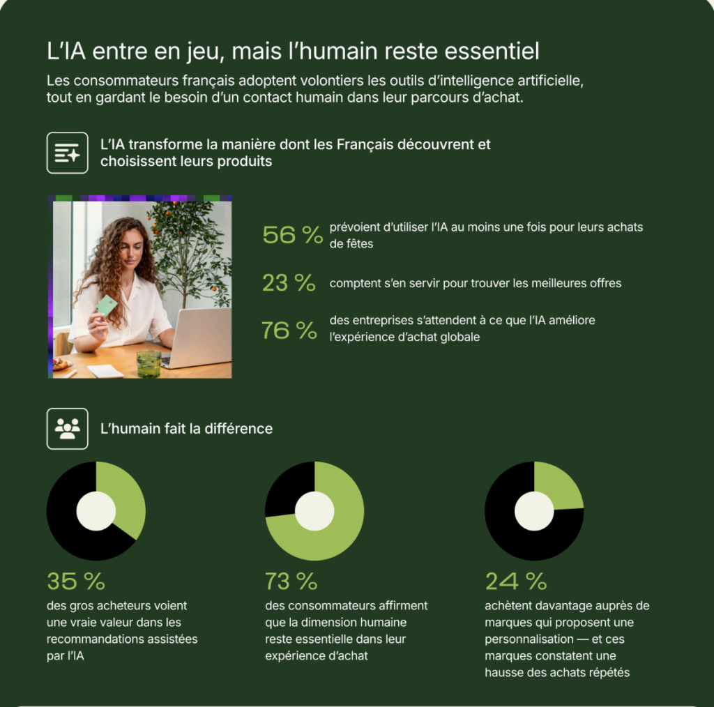 L’intelligence artificielle s’invite elle aussi dans le shopping des fêtes : 56 % des Français se disent prêts à l’utiliser pour trouver des idées cadeaux ou comparer les prix, tandis que 35 % des foyers aisés ont déjà acheté auprès de marques proposant des recommandations personnalisées. Mais la confiance reste fragile : 65 % se disent encore méfiants et 73 % estiment qu’acheter auprès d’une personne reste essentiel.